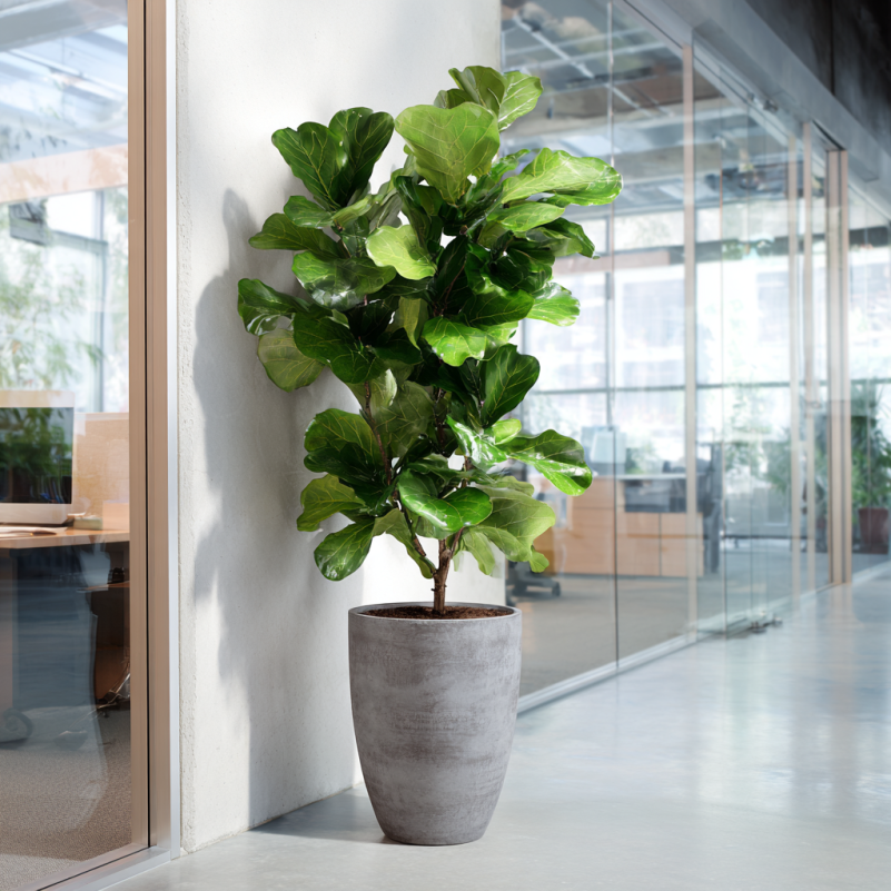 Lobby Anchors Impress guests with a towering fake fiddle leaf fig tree. Ideal for filling large vertical voids in commercial foyers.